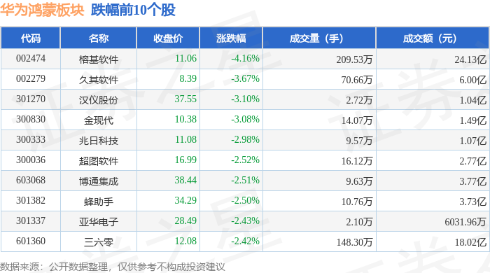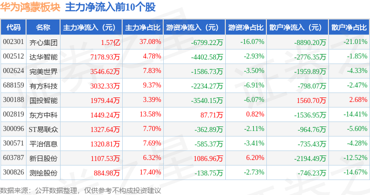 从资金流向上来看,当日华为鸿蒙板块主力资金净流出24.15亿元,游资资金净流入2.63亿元,散户资金净流入21.52亿元。华为鸿蒙板块个股资金流向见下表: