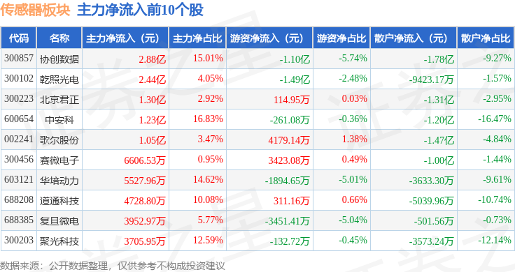从资金流向上来看,当日传感器板块主力资金净流出27.61亿元,游资资金净流入5.43亿元,散户资金净流入22.18亿元。传感器板块个股资金流向见下表: