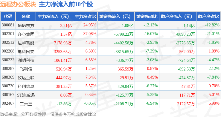 从资金流向上来看,当日远程办公板块主力资金净流出10.74亿元,游资资金净流出1.73亿元,散户资金净流入12.47亿元。远程办公板块个股资金流向见下表:
