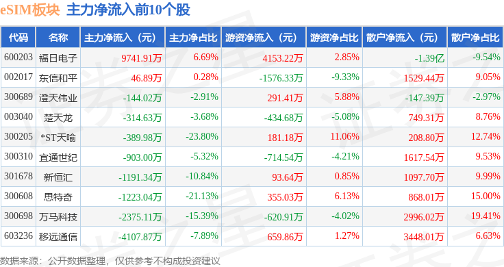 从资金流向上来看,当日eSIM板块主力资金净流出5.2亿元,游资资金净流入1.31亿元,散户资金净流入3.89亿元。eSIM板块个股资金流向见下表: