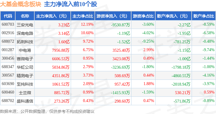 从资金流向上来看,当日大基金概念板块主力资金净流出10.98亿元,游资资金净流入3.51亿元,散户资金净流入7.47亿元。大基金概念板块个股资金流向见下表: