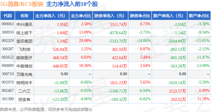 从资金流向上来看,当日5G消息/RCS板块主力资金净流出9.26亿元,游资资金净流出913.83万元,散户资金净流入9.35亿元。5G消息/RCS板块个股资金流向见下表: