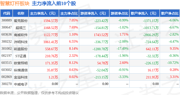 从资金流向上来看,当日智慧灯杆板块主力资金净流出10.11亿元,游资资金净流入1.5亿元,散户资金净流入8.61亿元。智慧灯杆板块个股资金流向见下表: