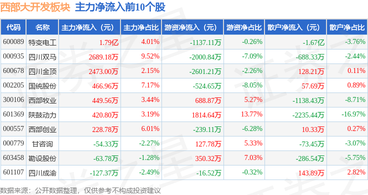 从资金流向上来看,当日西部大开发板块主力资金净流出8.44亿元,游资资金净流入3.3亿元,散户资金净流入5.14亿元。西部大开发板块个股资金流向见下表: