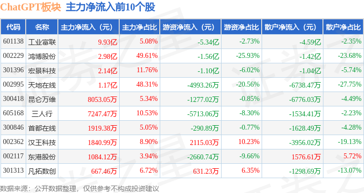 从资金流向上来看,当日ChatGPT板块主力资金净流入1.47亿元,游资资金净流出7.41亿元,散户资金净流入5.95亿元。ChatGPT板块个股资金流向见下表: