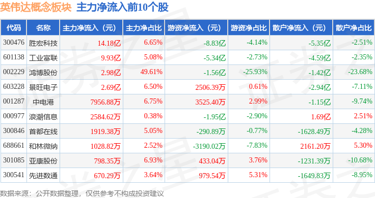 从资金流向上来看,当日英伟达概念板块主力资金净流入20.93亿元,游资资金净流出14.36亿元,散户资金净流出6.57亿元。英伟达概念板块个股资金流向见下表: