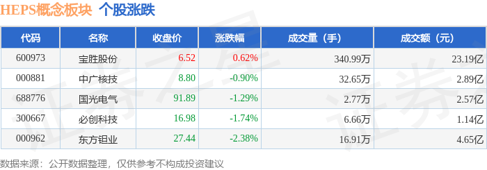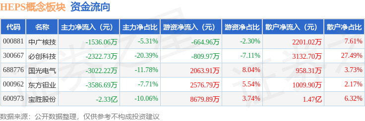 从资金流向上来看,当日HEPS概念板块主力资金净流出3.38亿元,游资资金净流入1.18亿元,散户资金净流入2.2亿元。HEPS概念板块个股资金流向见下表: