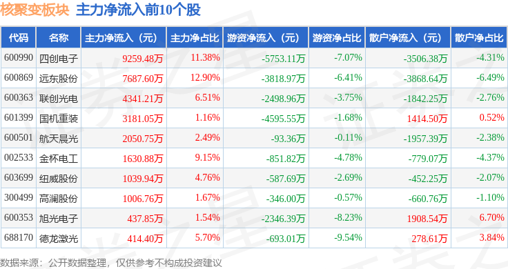 从资金流向上来看,当日核聚变板块主力资金净流出23.85亿元,游资资金净流出1268.09万元,散户资金净流入23.98亿元。核聚变板块个股资金流向见下表: