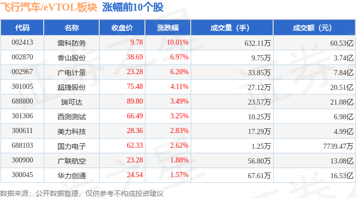 证券之星消息,12月9日飞行汽车/eVTOL板块较上一交易日下跌0.79%,光莆股份领跌。当日上证指数报收于3909.52,下跌0.37%。深证成指报收于13277.36,下跌0.39%。飞行汽车/eVTOL板块个股涨跌见下表:
