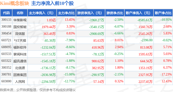 从资金流向上来看,当日Kimi概念板块主力资金净流出9.29亿元,游资资金净流入8582.34万元,散户资金净流入8.43亿元。Kimi概念板块个股资金流向见下表: