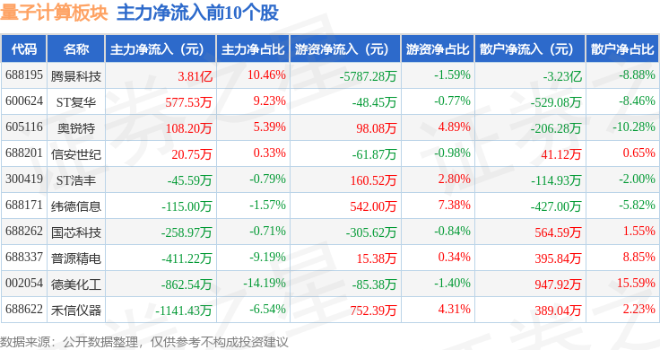 从资金流向上来看,当日量子计算板块主力资金净流出3.02亿元,游资资金净流入1.95亿元,散户资金净流入1.07亿元。量子计算板块个股资金流向见下表: