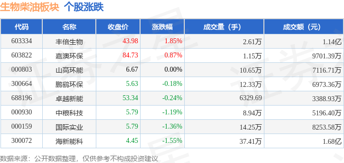 证券之星消息,12月9日生物柴油板块较上一交易日下跌0.6%,海新能科领跌。当日上证指数报收于3909.52,下跌0.37%。深证成指报收于13277.36,下跌0.39%。生物柴油板块个股涨跌见下表: