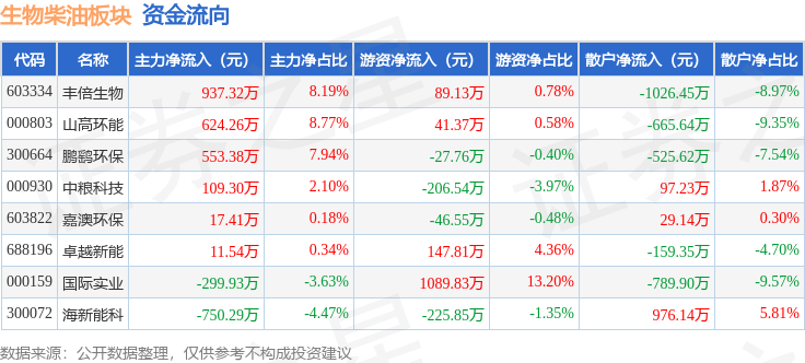 从资金流向上来看,当日生物柴油板块主力资金净流入1203.0万元,游资资金净流入861.45万元,散户资金净流出2064.45万元。生物柴油板块个股资金流向见下表: