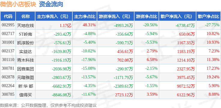 从资金流向上来看,当日微信小店板块主力资金净流出1.31亿元,游资资金净流出5911.18万元,散户资金净流入1.9亿元。微信小店板块个股资金流向见下表: