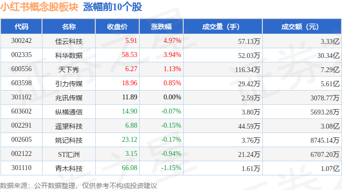 证券之星消息,12月9日小红书概念股板块较上一交易日下跌1.07%,光云科技领跌。当日上证指数报收于3909.52,下跌0.37%。深证成指报收于13277.36,下跌0.39%。小红书概念股板块个股涨跌见下表:
