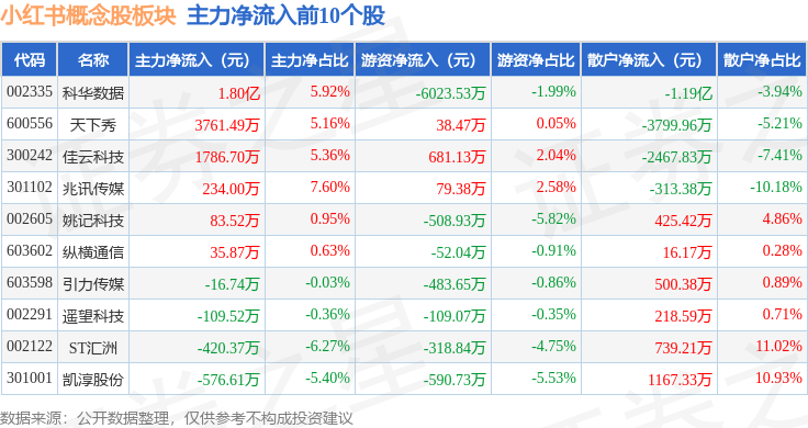 从资金流向上来看,当日小红书概念股板块主力资金净流出9.12亿元,游资资金净流出5404.69万元,散户资金净流入9.66亿元。小红书概念股板块个股资金流向见下表: