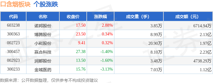 证券之星消息,12月9日口含烟板块较上一交易日下跌0.8%,金城医药领跌。当日上证指数报收于3909.52,下跌0.37%。深证成指报收于13277.36,下跌0.39%。口含烟板块个股涨跌见下表: