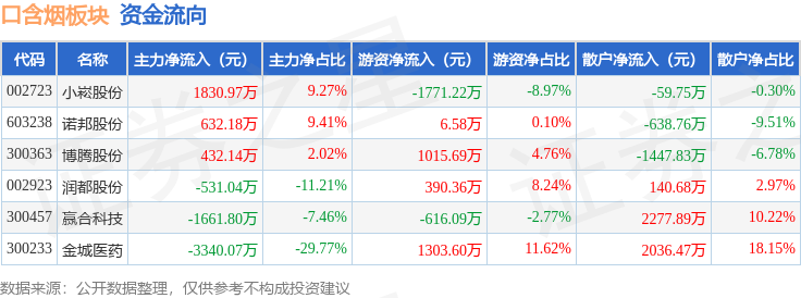 从资金流向上来看,当日口含烟板块主力资金净流出2637.62万元,游资资金净流入328.91万元,散户资金净流入2308.71万元。口含烟板块个股资金流向见下表: