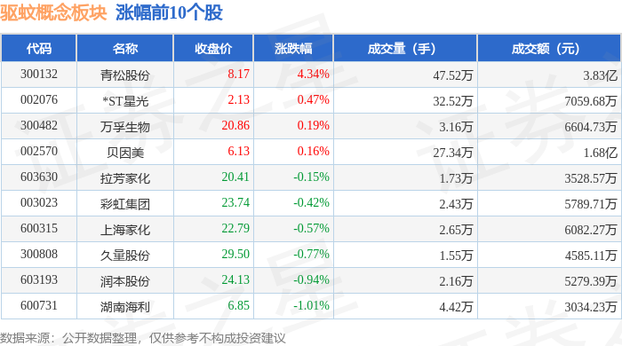 证券之星消息,12月9日驱蚊概念板块较上一交易日下跌1.07%,康芝药业领跌。当日上证指数报收于3909.52,下跌0.37%。深证成指报收于13277.36,下跌0.39%。驱蚊概念板块个股涨跌见下表: