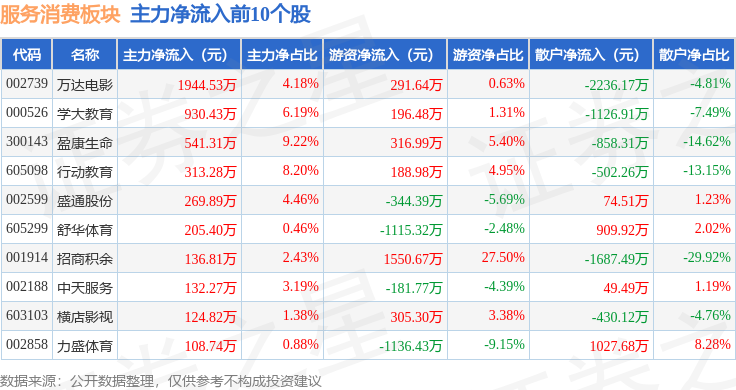从资金流向上来看,当日服务消费板块主力资金净流出4.77亿元,游资资金净流入2.05亿元,散户资金净流入2.72亿元。服务消费板块个股资金流向见下表: