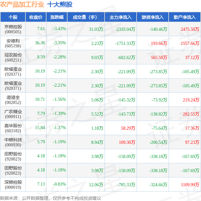 个股表现方面,农产品加工行业当日领跌股为京粮控股(000505),该股当日报收7.61,下跌3.43%,成交量31.03万,主力资金净流出2335.04万元。安德利(605198)以下跌3.35%紧随其后,该股当日成交量2.23万,主力资金净流出1751.33万元。除此之外,冠农股份(600251)、欧福蛋业(920371)、欧福蛋业(920371)均进入当日熊股之列。具体个股列表见下表: