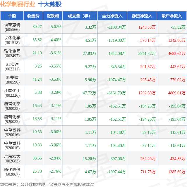 个股表现方面,化学制品行业当日领跌股为福莱蒽特(605566),该股当日报收30.27,下跌5.02%,成交量3.32万,主力资金净流出1188.04万元。长华化学(301518)以下跌4.4%紧随其后,该股当日成交量4.51万,主力资金净流出1719.0万元。除此之外,雅化集团(002497)、ST宏达(002211)、利安隆(300596)均进入当日熊股之列。具体个股列表见下表: