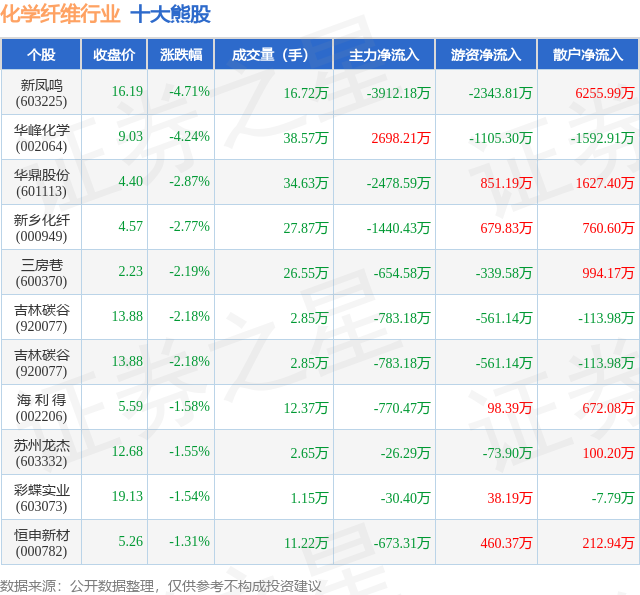个股表现方面,化学纤维行业当日领跌股为新凤鸣(603225),该股当日报收16.19,下跌4.71%,成交量16.72万,主力资金净流出3912.18万元。华峰化学(002064)以下跌4.24%紧随其后,该股当日成交量38.57万,主力资金净流入2698.21万元。除此之外,华鼎股份(601113)、新乡化纤(000949)、三房巷(600370)均进入当日熊股之列。具体个股列表见下表: