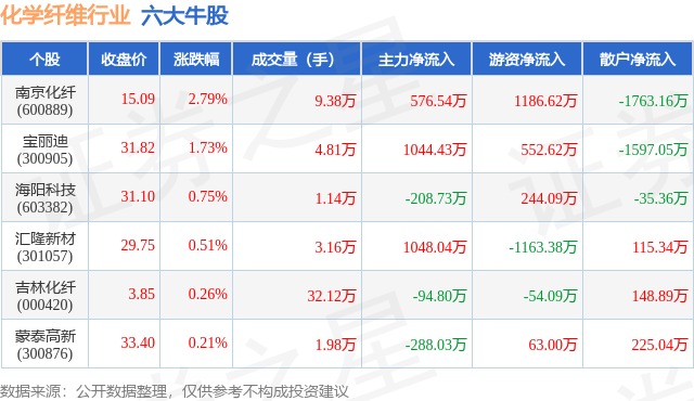 个股表现方面,化学纤维行业当日领涨股为南京化纤(600889),该股当日报收15.09,上涨2.79%,成交量9.38万,主力资金净流入576.54万元。宝丽迪(300905)以上涨1.73%紧随其后,该股当日成交量4.81万,主力资金净流入1044.43万元。除此之外,海阳科技(603382)、汇隆新材(301057)、吉林化纤(000420)均进入当日牛股之列。具体个股列表见下表: