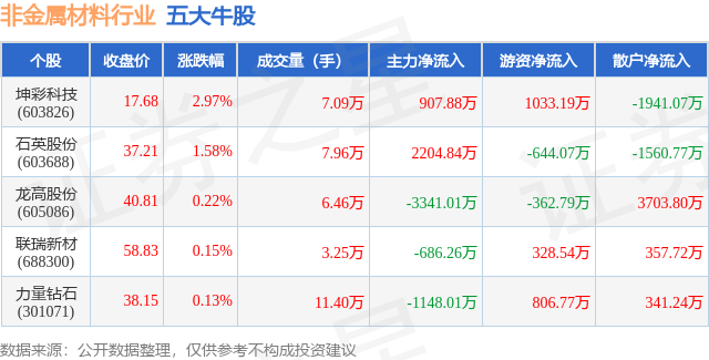 个股表现方面,非金属材料行业当日领涨股为坤彩科技(603826),该股当日报收17.68,上涨2.97%,成交量7.09万,主力资金净流入907.88万元。石英股份(603688)以上涨1.58%紧随其后,该股当日成交量7.96万,主力资金净流入2204.84万元。除此之外,龙高股份(605086)、联瑞新材(688300)、力量钻石(301071)均进入当日牛股之列。具体个股列表见下表: