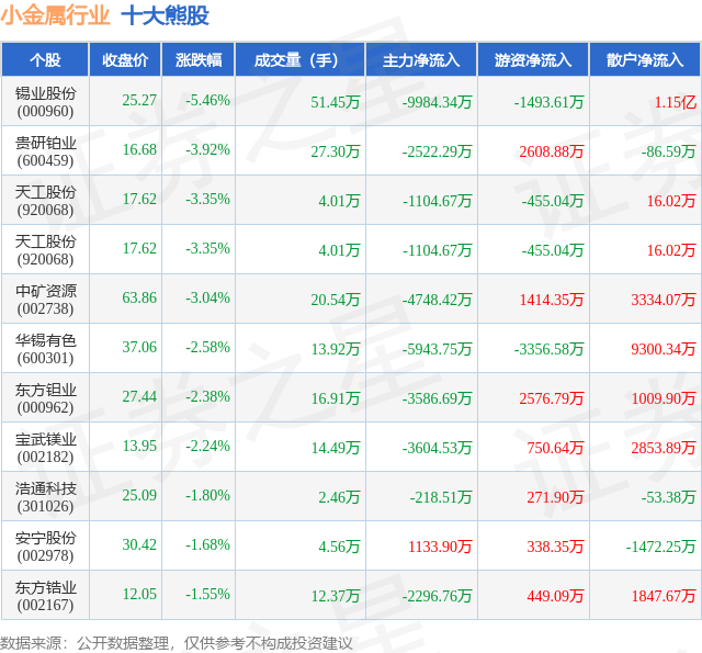 个股表现方面,小金属行业当日领跌股为锡业股份(000960),该股当日报收25.27,下跌5.46%,成交量51.45万,主力资金净流出9984.34万元。贵研铂业(600459)以下跌3.92%紧随其后,该股当日成交量27.3万,主力资金净流出2522.29万元。除此之外,天工股份(920068)、天工股份(920068)、中矿资源(002738)均进入当日熊股之列。具体个股列表见下表: