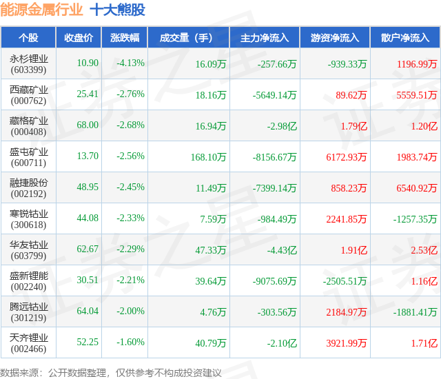 个股表现方面,能源金属行业当日领跌股为永杉锂业(603399),该股当日报收10.9,下跌4.13%,成交量16.09万,主力资金净流出257.66万元。西藏矿业(000762)以下跌2.76%紧随其后,该股当日成交量18.16万,主力资金净流出5649.14万元。除此之外,藏格矿业(000408)、盛屯矿业(600711)、融捷股份(002192)均进入当日熊股之列。具体个股列表见下表: