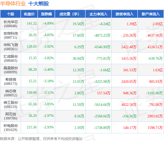 个股表现方面,半导体行业当日领跌股为长光华芯(688048),该股当日报收141.22,下跌4.89%,成交量19.58万,主力资金净流出4.24亿元。宏微科技(688711)以下跌4.01%紧随其后,该股当日成交量17.6万,主力资金净流出4873.25万元。除此之外,中科飞测(688361)、汇成股份(688403)、晶晨股份(688099)均进入当日熊股之列。具体个股列表见下表:
