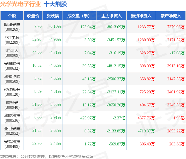 个股表现方面,光学光电子行业当日领跌股为联建光电(300269),该股当日报收7.7,下跌6.1%,成交量123.94万,主力资金净流出8613.69万元。*ST宇顺(002289)以下跌4.96%紧随其后,该股当日成交量3.5万,主力资金净流出3451.52万元。除此之外,汇创达(300909)、光莆股份(300632)、华塑控股(000509)均进入当日熊股之列。具体个股列表见下表: