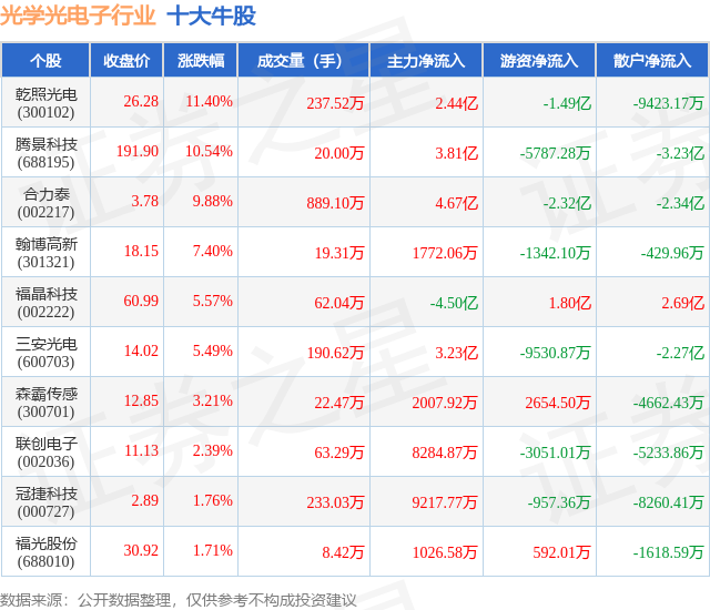 个股表现方面,光学光电子行业当日领涨股为乾照光电(300102),该股当日报收26.28,上涨11.4%,成交量237.52万,主力资金净流入2.44亿元。腾景科技(688195)以上涨10.54%紧随其后,该股当日成交量20.0万,主力资金净流入3.81亿元。除此之外,合力泰(002217)、翰博高新(301321)、福晶科技(002222)均进入当日牛股之列。具体个股列表见下表: