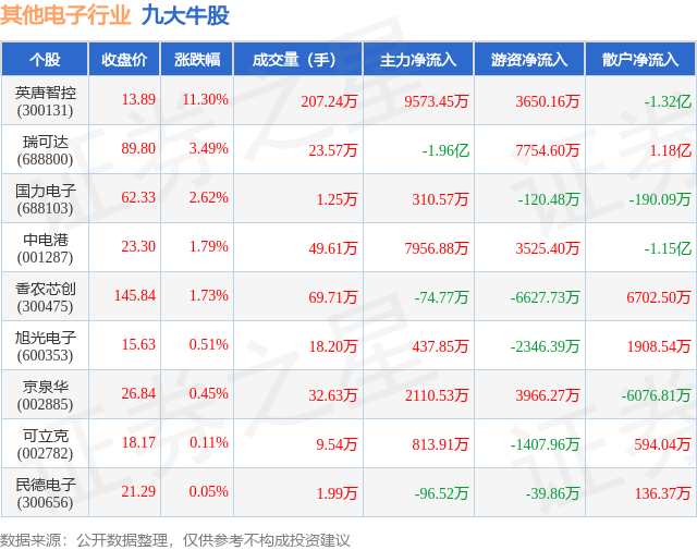 个股表现方面,其他电子行业当日领涨股为英唐智控(300131),该股当日报收13.89,上涨11.3%,成交量207.24万,主力资金净流入9573.45万元。瑞可达(688800)以上涨3.49%紧随其后,该股当日成交量23.57万,主力资金净流出1.96亿元。除此之外,国力电子(688103)、中电港(001287)、香农芯创(300475)均进入当日牛股之列。具体个股列表见下表: