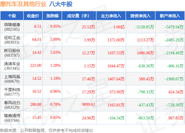 个股表现方面,摩托车及其他行业当日领涨股为信隆健康(002105),该股当日报收8.51,上涨9.95%,成交量25.53万,主力资金净流入1.06亿元。征和工业(003033)以上涨5.89%紧随其后,该股当日成交量3.99万,主力资金净流入1372.0万元。除此之外,新日股份(603787)、涛涛车业(301345)、上海凤凰(600679)均进入当日牛股之列。具体个股列表见下表: