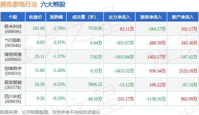 个股表现方面,黑色家电行业当日领跌股为极米科技(688696),该股当日报收105.0,下跌2.7%,成交量7540.0,主力资金净流入82.11万元。*ST高斯(002848)以下跌2.31%紧随其后,该股当日成交量6.04万,主力资金净流出831.97万元。除此之外,海信视像(600060)、创维数字(000810)、辰奕智能(301578)均进入当日熊股之列。具体个股列表见下表: