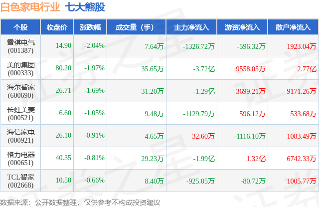 个股表现方面,白色家电行业当日领跌股为雪祺电气(001387),该股当日报收14.9,下跌2.04%,成交量7.64万,主力资金净流出1326.72万元。美的集团(000333)以下跌1.97%紧随其后,该股当日成交量35.65万,主力资金净流出3.72亿元。除此之外,海尔智家(600690)、长虹美菱(000521)、海信家电(000921)均进入当日熊股之列。具体个股列表见下表:
