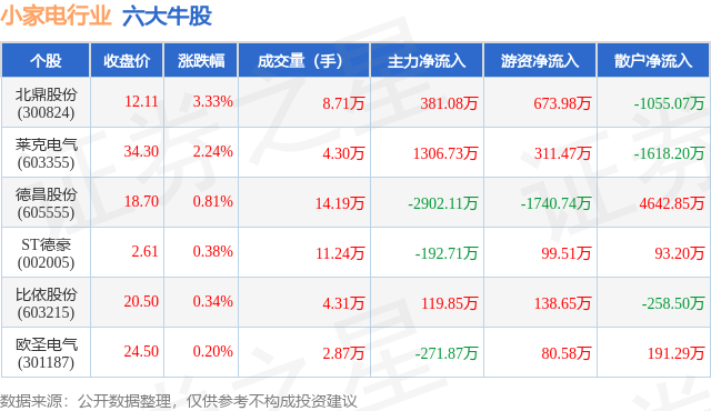 个股表现方面,小家电行业当日领涨股为北鼎股份(300824),该股当日报收12.11,上涨3.33%,成交量8.71万,主力资金净流入381.08万元。莱克电气(603355)以上涨2.24%紧随其后,该股当日成交量4.3万,主力资金净流入1306.73万元。除此之外,德昌股份(605555)、ST德豪(002005)、比依股份(603215)均进入当日牛股之列。具体个股列表见下表: