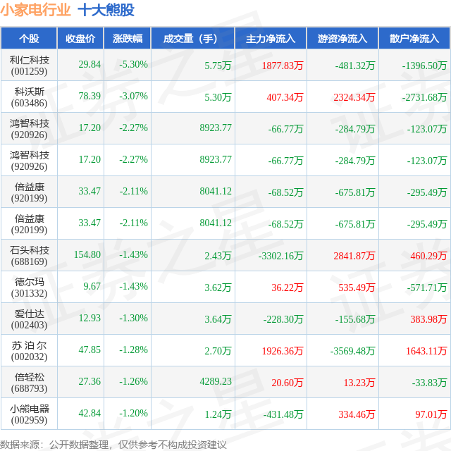 个股表现方面,小家电行业当日领跌股为利仁科技(001259),该股当日报收29.84,下跌5.3%,成交量5.75万,主力资金净流入1877.83万元。科沃斯(603486)以下跌3.07%紧随其后,该股当日成交量5.3万,主力资金净流入407.34万元。除此之外,鸿智科技(920926)、鸿智科技(920926)、倍益康(920199)均进入当日熊股之列。具体个股列表见下表:
