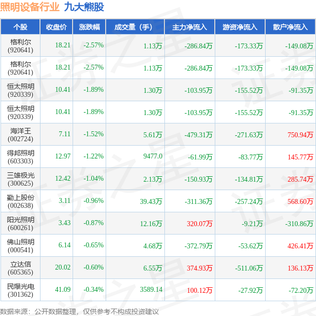 个股表现方面,照明设备行业当日领跌股为格利尔(920641),该股当日报收18.21,下跌2.57%,成交量1.13万,主力资金净流出286.84万元。格利尔(920641)以下跌2.57%紧随其后,该股当日成交量1.13万,主力资金净流出286.84万元。除此之外,恒太照明(920339)、恒太照明(920339)、海洋王(002724)均进入当日熊股之列。具体个股列表见下表: