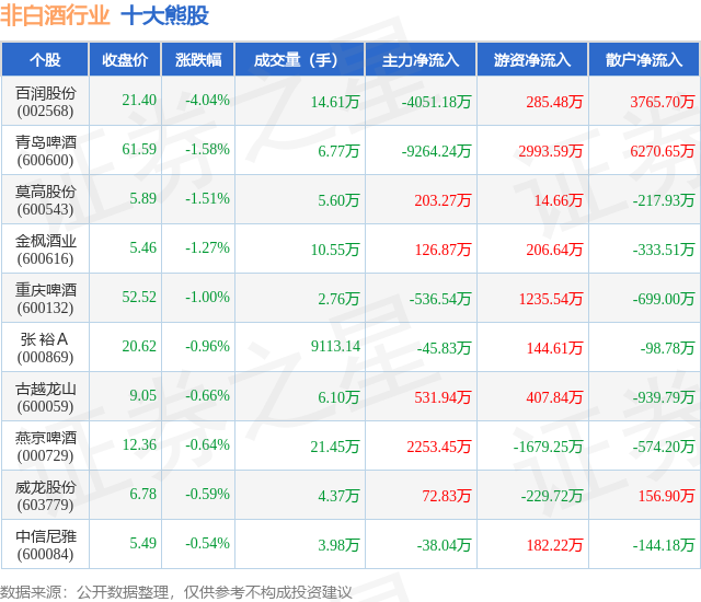 个股表现方面,非白酒行业当日领跌股为百润股份(002568),该股当日报收21.4,下跌4.04%,成交量14.61万,主力资金净流出4051.18万元。青岛啤酒(600600)以下跌1.58%紧随其后,该股当日成交量6.77万,主力资金净流出9264.24万元。除此之外,莫高股份(600543)、金枫酒业(600616)、重庆啤酒(600132)均进入当日熊股之列。具体个股列表见下表: