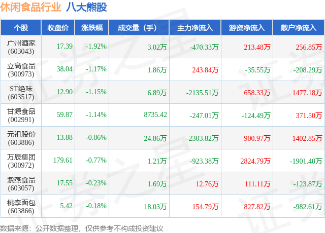 个股表现方面,休闲食品行业当日领跌股为广州酒家(603043),该股当日报收17.39,下跌1.92%,成交量3.02万,主力资金净流出470.33万元。立高食品(300973)以下跌1.17%紧随其后,该股当日成交量1.86万,主力资金净流入243.84万元。除此之外,ST绝味(603517)、甘源食品(002991)、元祖股份(603886)均进入当日熊股之列。具体个股列表见下表: