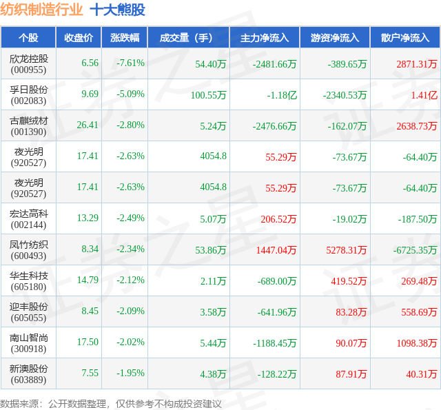 个股表现方面,纺织制造行业当日领跌股为欣龙控股(000955),该股当日报收6.56,下跌7.61%,成交量54.4万,主力资金净流出2481.66万元。孚日股份(002083)以下跌5.09%紧随其后,该股当日成交量100.55万,主力资金净流出1.18亿元。除此之外,古麒绒材(001390)、夜光明(920527)、夜光明(920527)均进入当日熊股之列。具体个股列表见下表: