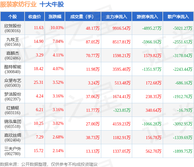 个股表现方面,服装家纺行业当日领涨股为欣贺股份(003016),该股当日报收11.63,上涨10.03%,成交量48.17万,主力资金净流入9916.54万元。九牧王(601566)以上涨7.04%紧随其后,该股当日成交量87.05万,主力资金净流入8517.81万元。除此之外,嘉麟杰(002486)、酷特智能(300840)、众望布艺(605003)均进入当日牛股之列。具体个股列表见下表: