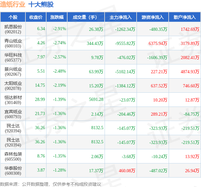 个股表现方面,造纸行业当日领跌股为凯恩股份(002012),该股当日报收6.34,下跌2.91%,成交量26.38万,主力资金净流出1262.34万元。青山纸业(600103)以下跌2.74%紧随其后,该股当日成交量344.43万,主力资金净流出9555.82万元。除此之外,华旺科技(605377)、景兴纸业(002067)、太阳纸业(002078)均进入当日熊股之列。具体个股列表见下表: