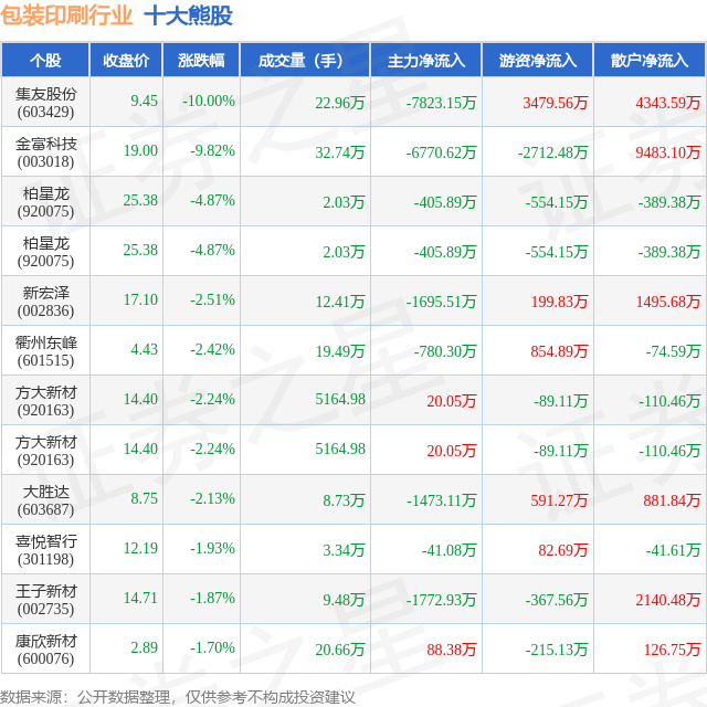 个股表现方面,包装印刷行业当日领跌股为集友股份(603429),该股当日报收9.45,下跌10.0%,成交量22.96万,主力资金净流出7823.15万元。金富科技(003018)以下跌9.82%紧随其后,该股当日成交量32.74万,主力资金净流出6770.62万元。除此之外,柏星龙(920075)、柏星龙(920075)、新宏泽(002836)均进入当日熊股之列。具体个股列表见下表: