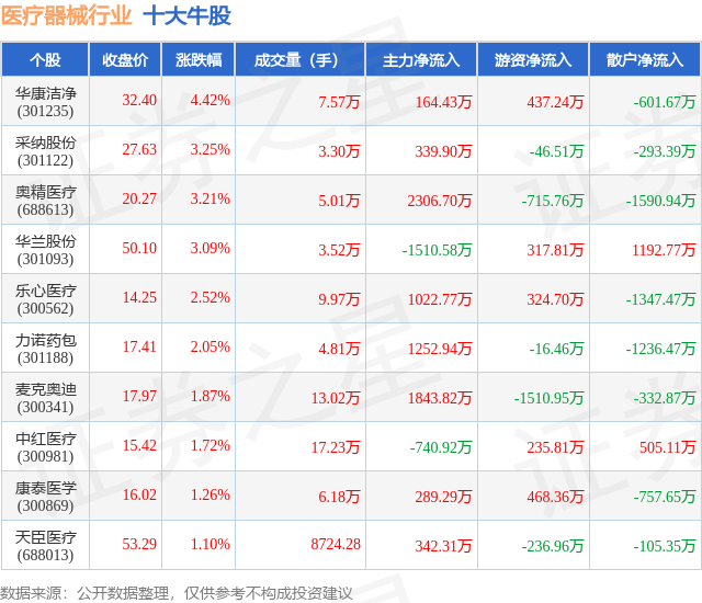 个股表现方面,医疗器械行业当日领涨股为华康洁净(301235),该股当日报收32.4,上涨4.42%,成交量7.57万,主力资金净流入164.43万元。采纳股份(301122)以上涨3.25%紧随其后,该股当日成交量3.3万,主力资金净流入339.9万元。除此之外,奥精医疗(688613)、华兰股份(301093)、乐心医疗(300562)均进入当日牛股之列。具体个股列表见下表: