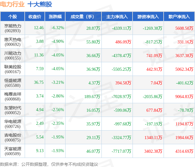 个股表现方面,电力行业当日领跌股为京能热力(002893),该股当日报收12.46,下跌6.32%,成交量28.87万,主力资金净流出4339.11万元。惠天热电(000692)以下跌4.9%紧随其后,该股当日成交量55.8万,主力资金净流入486.09万元。除此之外,川能动力(000155)、联美控股(600167)、恒盛能源(605580)均进入当日熊股之列。具体个股列表见下表: