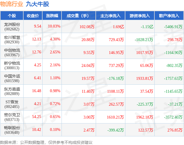 个股表现方面,物流行业当日领涨股为龙洲股份(002682),该股当日报收9.54,上涨10.03%,成交量102.08万,主力资金净流入1.69亿元。宏川智慧(002930)以上涨4.3%紧随其后,该股当日成交量20.88万,主力资金净流入729.43万元。除此之外,中创物流(603967)、新宁物流(300013)、中国外运(601598)均进入当日牛股之列。具体个股列表见下表:
